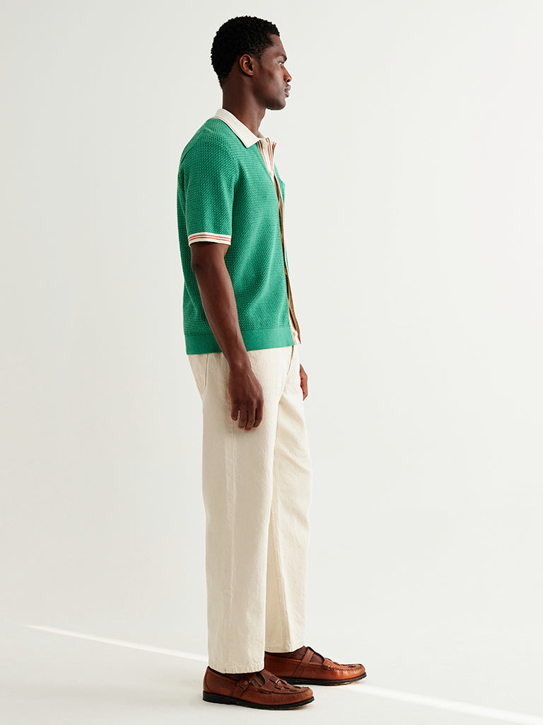 The Belle is a button-through knitted polo shirt, crafted in an airy linen-cotton blend pointelle knit with tiny open holes for breathability. It’s finished with a retro sports-inspired collar and placket, detailed with fine stripe tipping in ecru contrast against a green base.